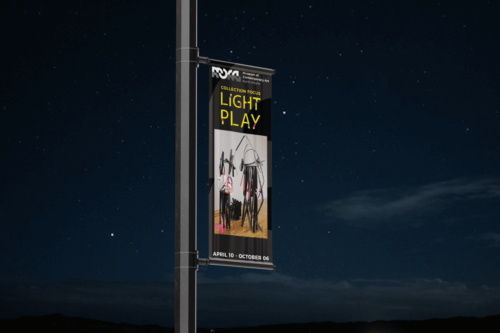 As the designer for this exhibition, I had the chance to create a playful title treatment that reflects the collaborative nature of the show, featuring a group of talented artists. From UV installations to nostalgic neon sculptures, visitors can explore how contemporary artists harness light to illuminate powerful ideas. For the brand identity, I drew inspiration from the colors found within the artwork on display, with the yellow symbolizing the vibrant light cutting through the dark gallery space.